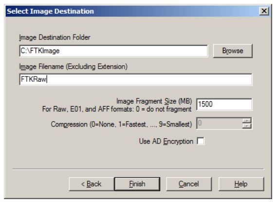 مقصد تصویر را انتخاب کنید: به پوشهای که با نام FTKImage در درایو C: ایجاد کردهایم، رفته و به تصویر یک نام فایل اختصاص میدهیم. Image Fragment Size ، اندازه هر قطعه را نشان میدهد وقتی میخواهید یک فایل تصویر بزرگتر را به چند قسمت تقسیم کنید. Compression ، سطح فشردهسازی فایل تصویر را نشان میدهد، از 0 (بدون فشردهسازی) تا 9 (حداکثر فشردهسازی - و فرآیند ایجاد تصویر کندتر). برای تصاویر خام فشرده نشده، فشردهسازی همیشه 0 است.