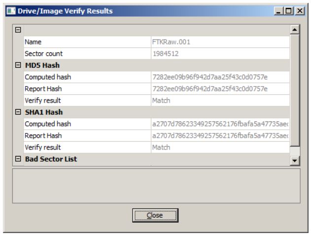Drive/Image Verify Results : پس از تکمیل تصویر، این پنجره بازشو ظاهر میشود تا نام فایل تصویر، تعداد سکتورها، مقادیر هش MD5 و SHA1 محاسبهشده (قبل از ایجاد تصویر) و گزارششده (بعد از ایجاد تصویر) را به همراه تأیید مطابقت آنها و لیستی از سکتورهای خراب (در صورت وجود) نشان دهد. تأیید هش یک بررسی کلیدی برای اطمینان از معتبر بودن تصویر است و مقادیر هش باید صرف نظر از نوع تصویری که ایجاد میکنید، یکسان باشند.